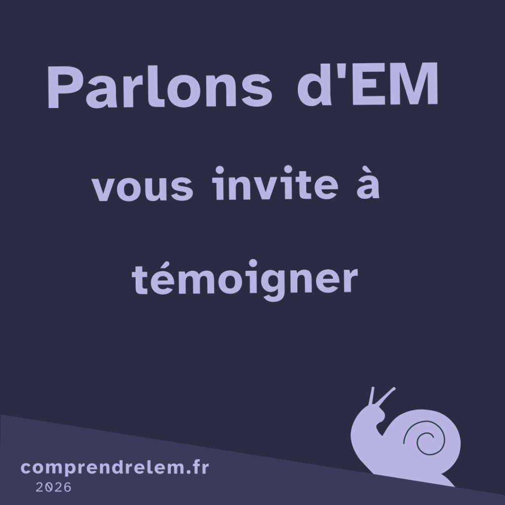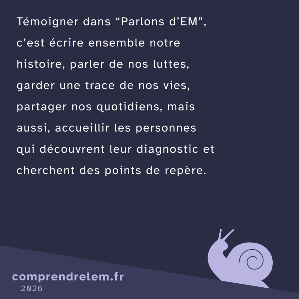 Témoigner dans “Parlons d’EM”, c’est écrire ensemble notre histoire, parler de nos luttes, garder une trace de nos vies, partager nos quotidiens, mais aussi, accueillir les personnes qui découvrent leur diagnostic et cherchent des points de repère.