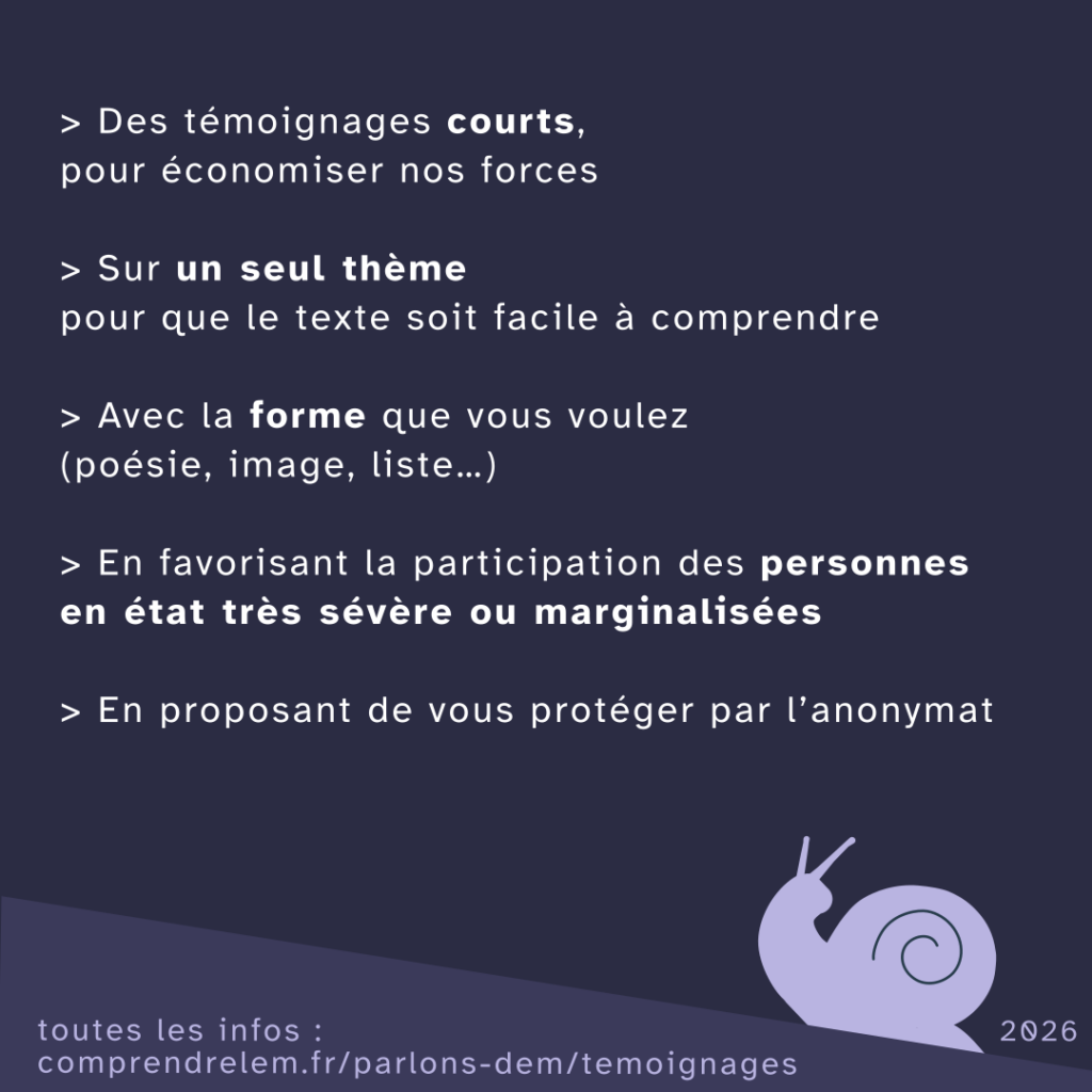 - Envoyez votre témoignage par mail à l’adresse suivante : anonyme [arobase] comprendrelem.fr